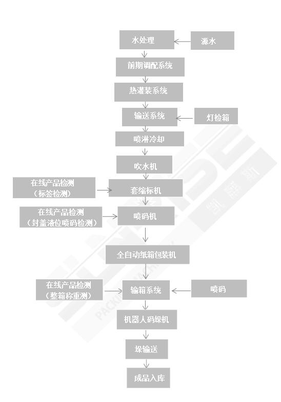 PET熱灌裝系統(tǒng)→燈檢→噴淋冷卻→吹水機(jī)1→套標(biāo)機(jī)→吹水機(jī)2→噴碼機(jī)→封口液位噴碼檢測(cè)→開箱→裝箱→封箱→機(jī)器人碼垛→入庫(kù)