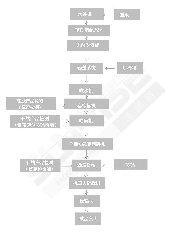PET無(wú)菌吹灌旋系統(tǒng)→燈檢→吹水機(jī)1→套標(biāo)機(jī)/貼標(biāo)機(jī)→吹水機(jī)2→噴碼機(jī)→封口液位噴碼檢測(cè)→開(kāi)箱→裝箱→封箱→機(jī)器人碼垛→入庫(kù)